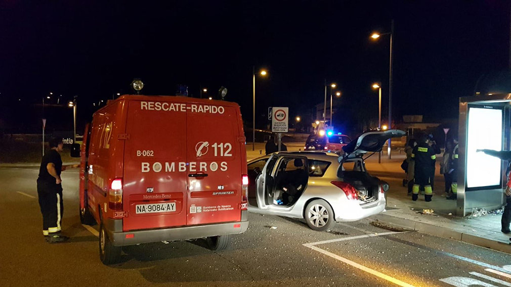 Los coches impactaron contra una marquesina ubicada en el lugar. Atendieron el siniestro dotaciones de los bomberos del parque de Cordovilla y patrullas de la Policía Foral y de la Policía Municipal.