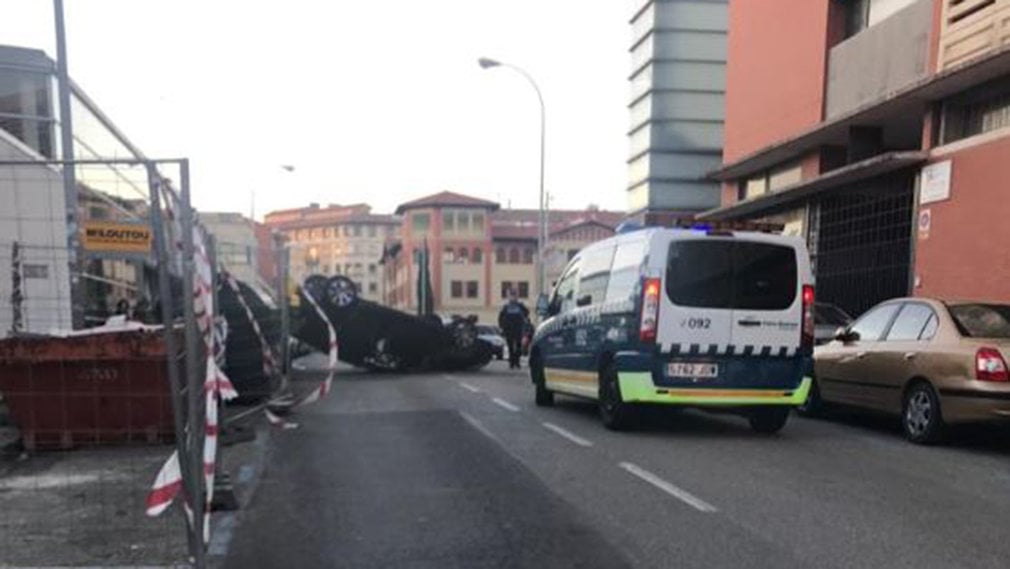 Un coche ha volcado a última hora de esta tarde de domingo después de sufrir un accidente en la calle de Sangüesa de Pamplona, junto a la entrada del centro de tecnificación deportiva estadio Larrabide.