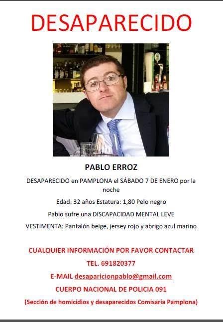 Tal y como relataba la familia, el joven sufre un discapacidad psíquica leve y no se conocían noticias de él desde hace dos días. La última vez que se vio a Pablo fue la madrugada del sábado al domingo, sobre las 2 horas, en la avenida Carlos III de Pamplona.