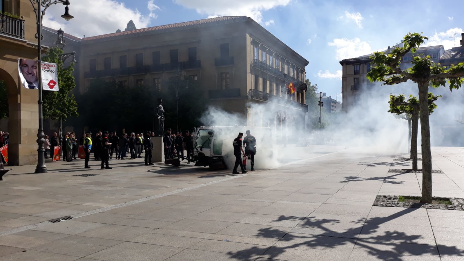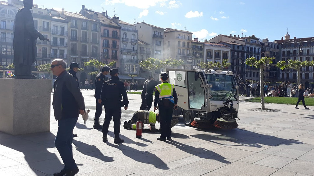 Policías y trabajadores municipales, junto a la barredora que se ha incendiado en el centro de Pamplona. AMAYA LUQUI