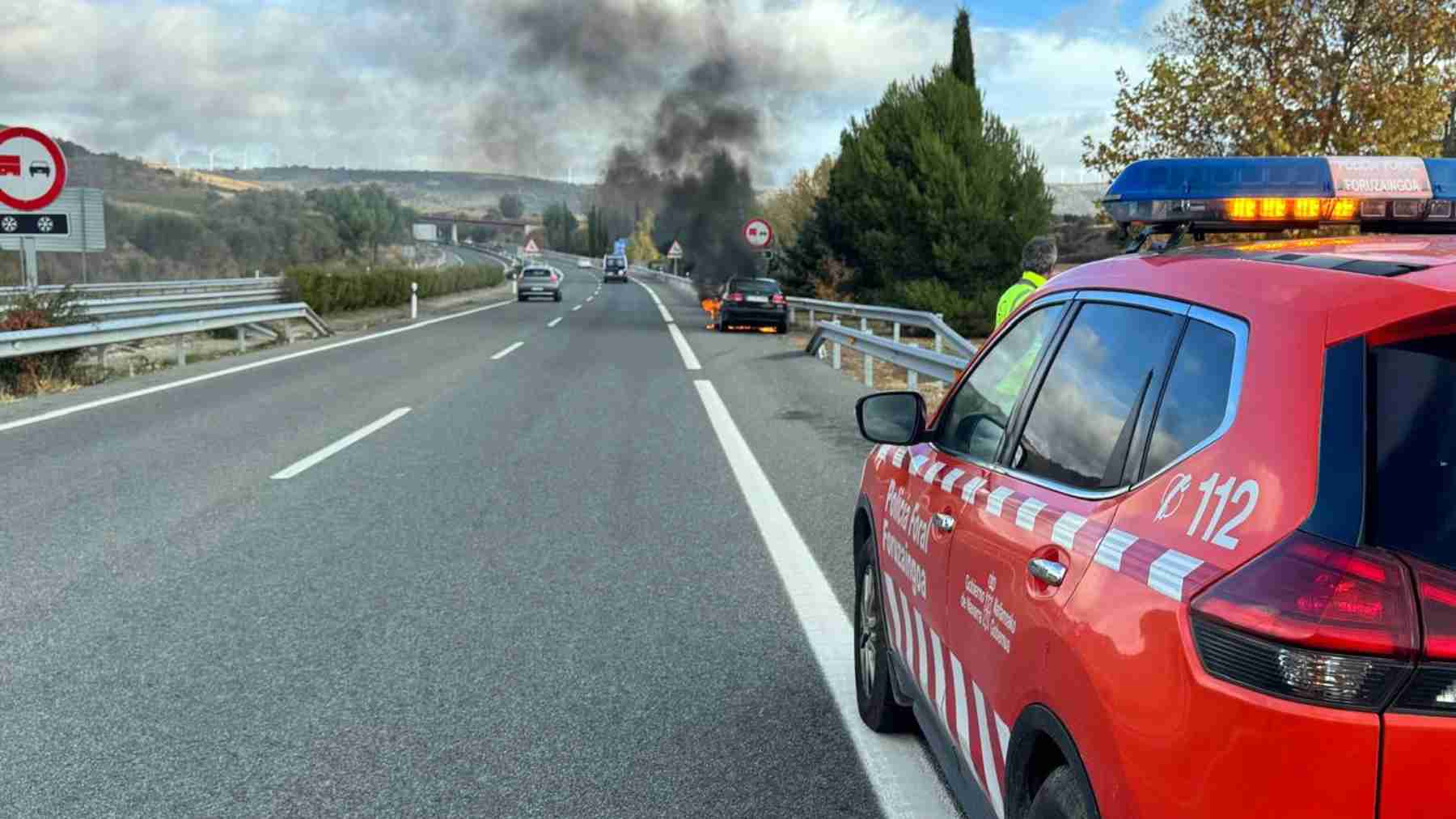 Cortado un carril de una autovía de Navarra por el aparatoso incendio de un coche