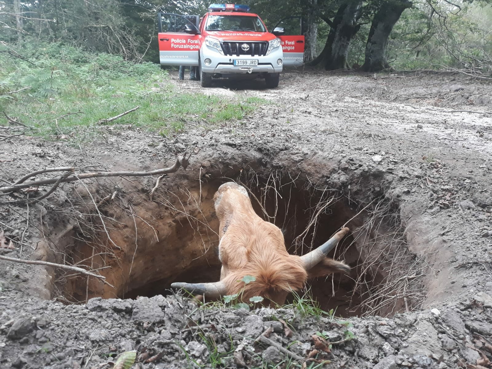 La Policía Foral ha comunicado que el equipo de Medio Ambiente del cuerpo se encuentra tratando de liberar a una vaca semienterranda tras hundirse el terreno en la Sierra de Urbasa