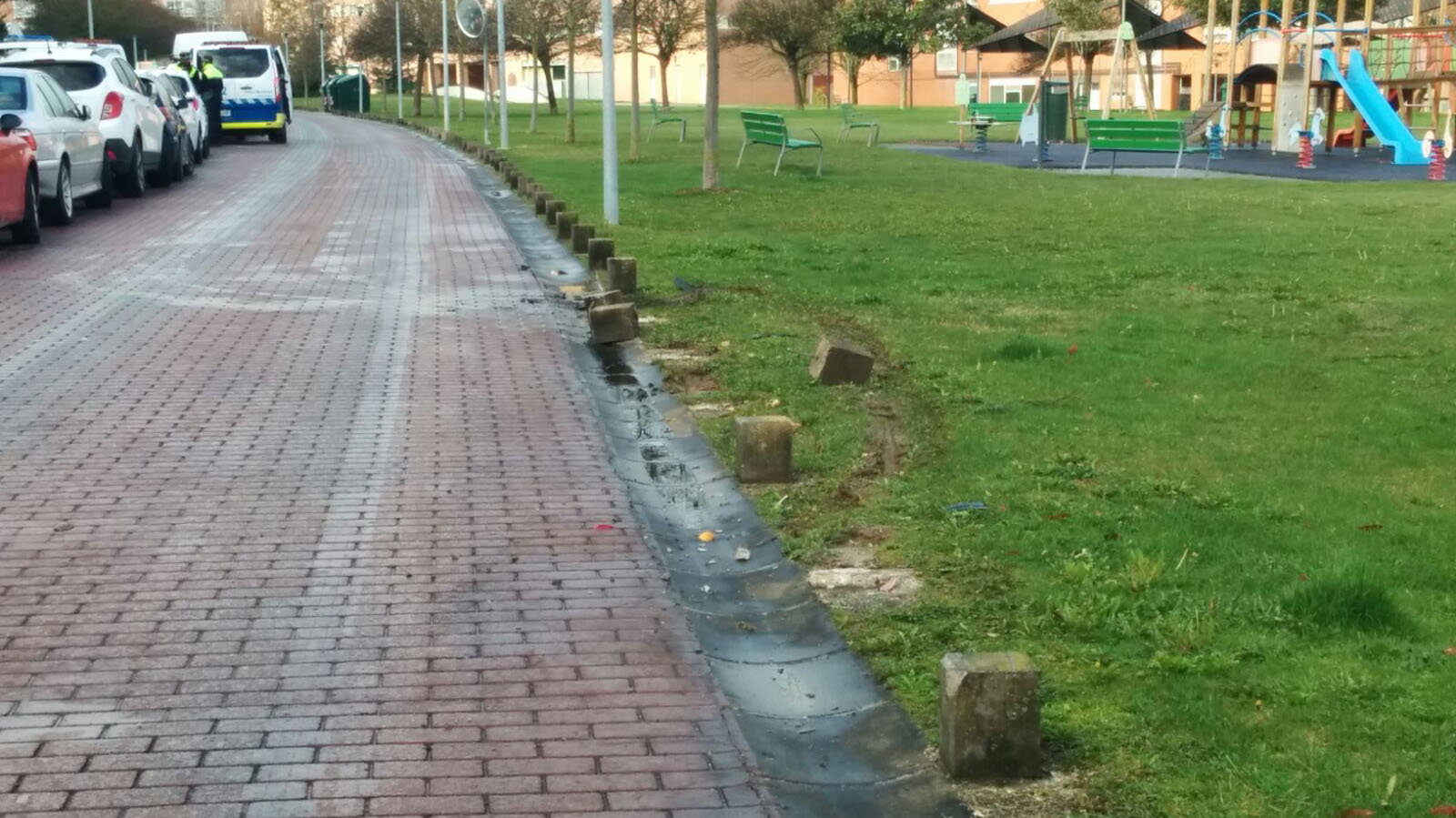Imagen de los bolardos arrancados por un conductor borracho que ha sufrido un accidente en la calle Concejo de Elía, en Pamplona. Foto: POLICÍA MUNICIPAL DE PAMPLONA