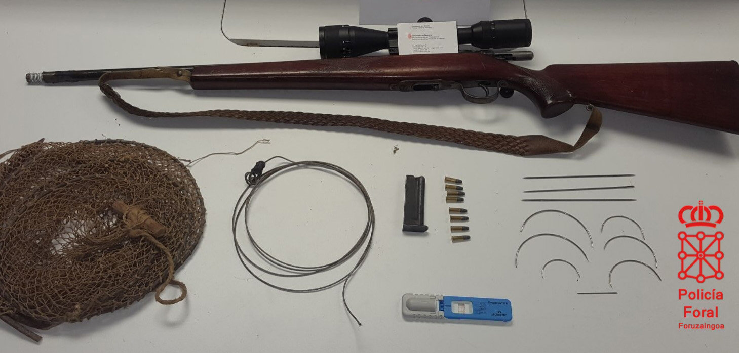 La Policía Foral le ha incautado un rifle, varios lazos y botrinos y ha comprobado que estaba influenciado por anfetaminas y cannabis.
