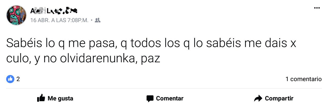 Tal y como se muestra en la imagen de esta información, A.L.P.C. quiso dejar constancia a través de internet de que algo le ocurría. El mensaje traslada un estado de malestar consigo mismo, además de con ciertas personas de su alrededor, a las que les dedica un tono desagradable.