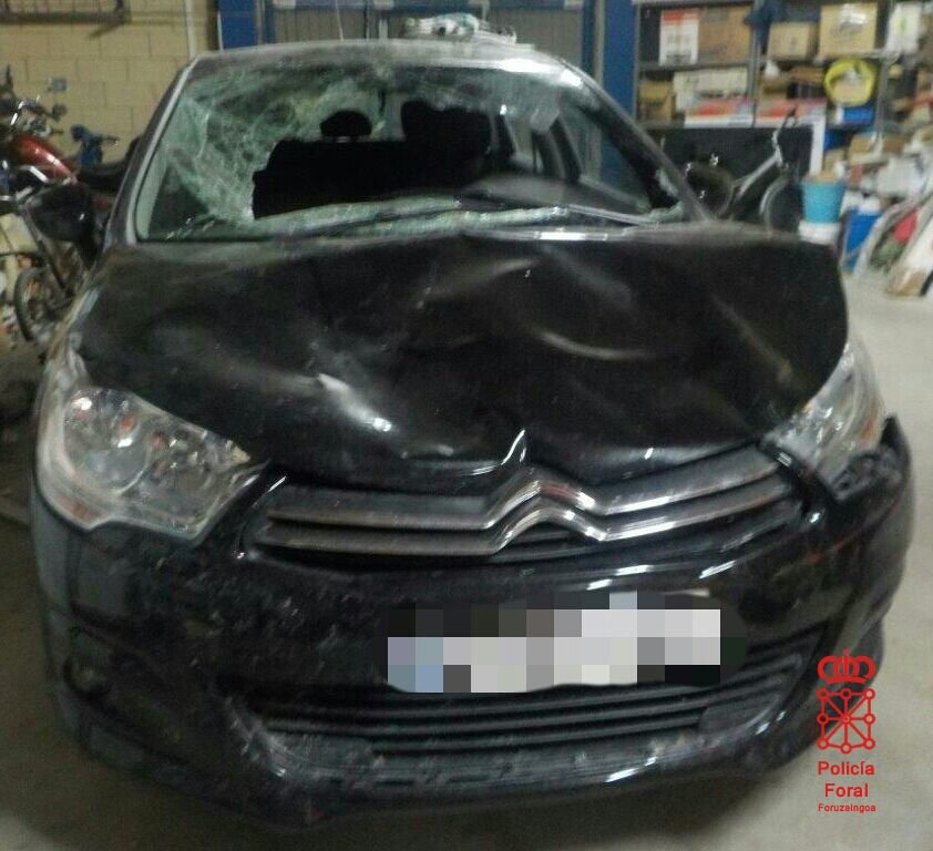 El propio conductor declaró el martes ante la juez de guardia que, tras el atropello y la posterior huída, limpió la sangre de la luna delantera. Después de esto, le comunicó lo ocurrido a su madre y se echó a dormir. Para este momento, el coche ya estaba en la posición y en el estado que muestra la imagen, que recogió la Policía Foral dentro de las investigaciones sobre el caso.