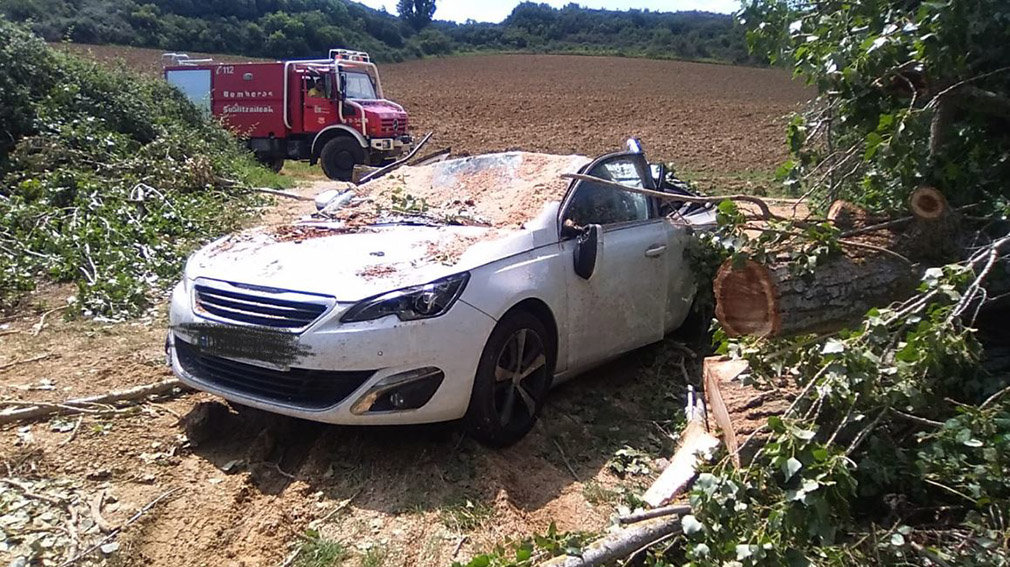 Según ha informado este domingo la Policía Foral, en el caso de Alloz, el suceso ha ocurrido cuando tres amigos, que habían accedido al pantano en el citado vehículo, han ido a refugiarse del vendaval al turismo, y el viento ha derribado un chopo de grandes dimensiones encima del coche, pudiendo los jóvenes escapar ilesos por pocos segundos.