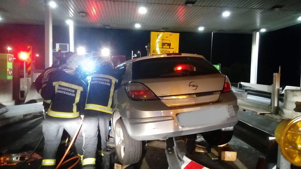 El conductor del vehículo ha tenido que ser desatrapado por los bomberos, al haber quedado el habitáculo del vehículo muy afectado por el choque contra el pretil del peaje.