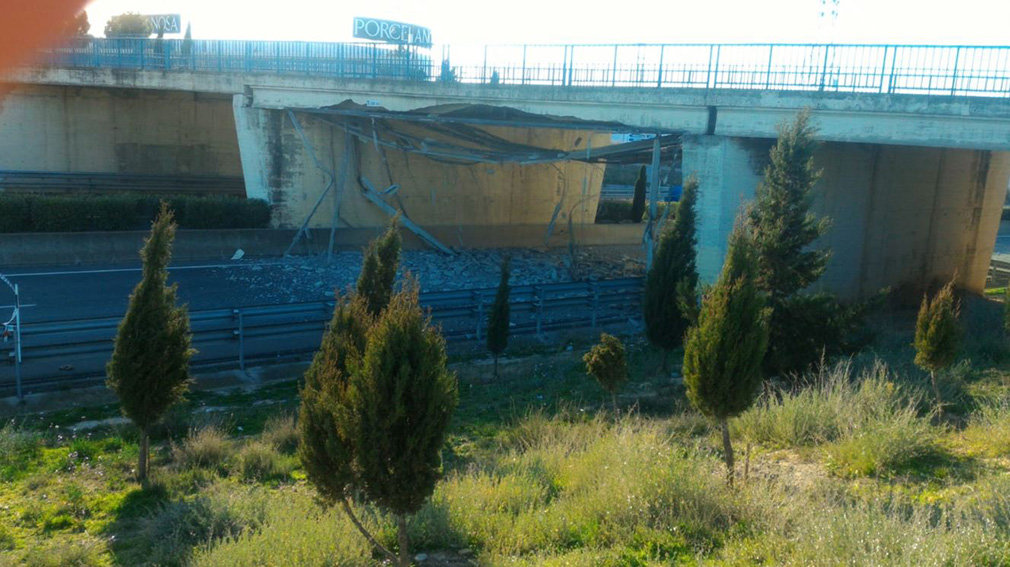Destrozos en el puente sobre la A-68 en Tudela a causa del accidente del camión. POLICÍA FORAL