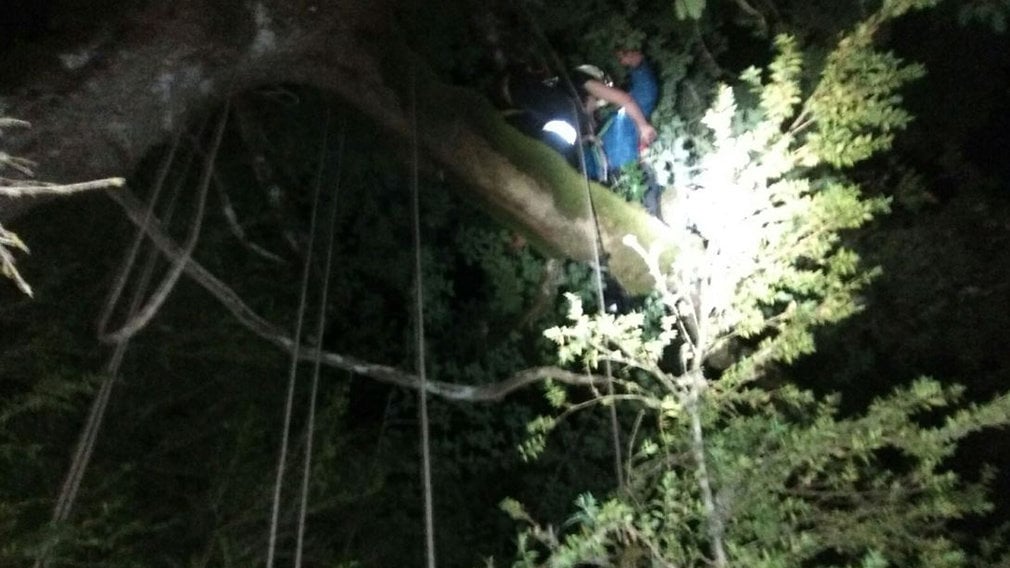Complicada maniobra de madrugada en Urzainqui. Los bomberos han rescatado a un joven parapentista francés que se ha quedado colgado durante horas en una zona arbolada de difícil acceso.