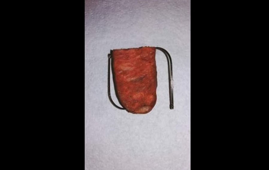Una vecina de Mendillorri alertaba en Facebook de que acababa de encontrar un trozo de chorizo con un anzuelo en Mendillorri, en el concejo de Elía y adjuntaba una foto.