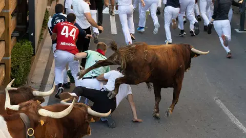 Además, como se puede apreciar en este vídeo, un mozo ha sido alcanzado por velocidad por el novillo colorado que se había adelantado a la manada en la avenida de Zaragoza y propinándole un tremendo golpe, le ha lanzado contra el vallado.