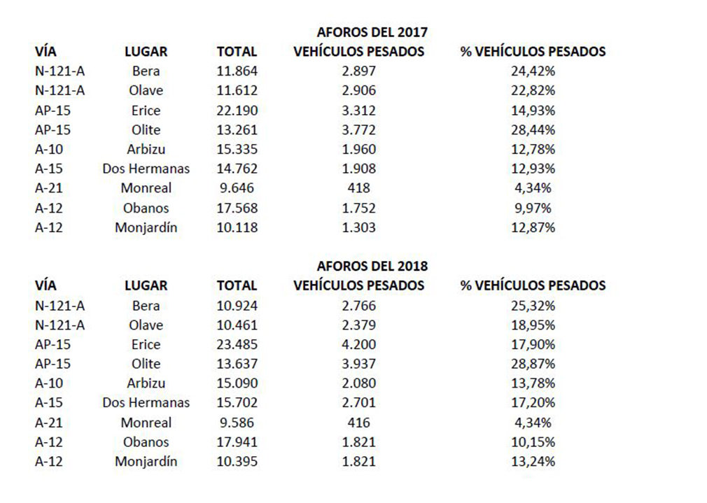 Para valorar esta necesidad, presento a continuación los datos de aforos de trafico de las carreteras navarras, publicados por el Gobierno de Navarra y correspondientes a los años 2017 y 2018. Son cifras referidas a las vías de alta capacidad señaladas anteriormente. Hay que destacar que los túneles de Belate y Almándoz estuvieron cerrados seis meses en el año 2018.
